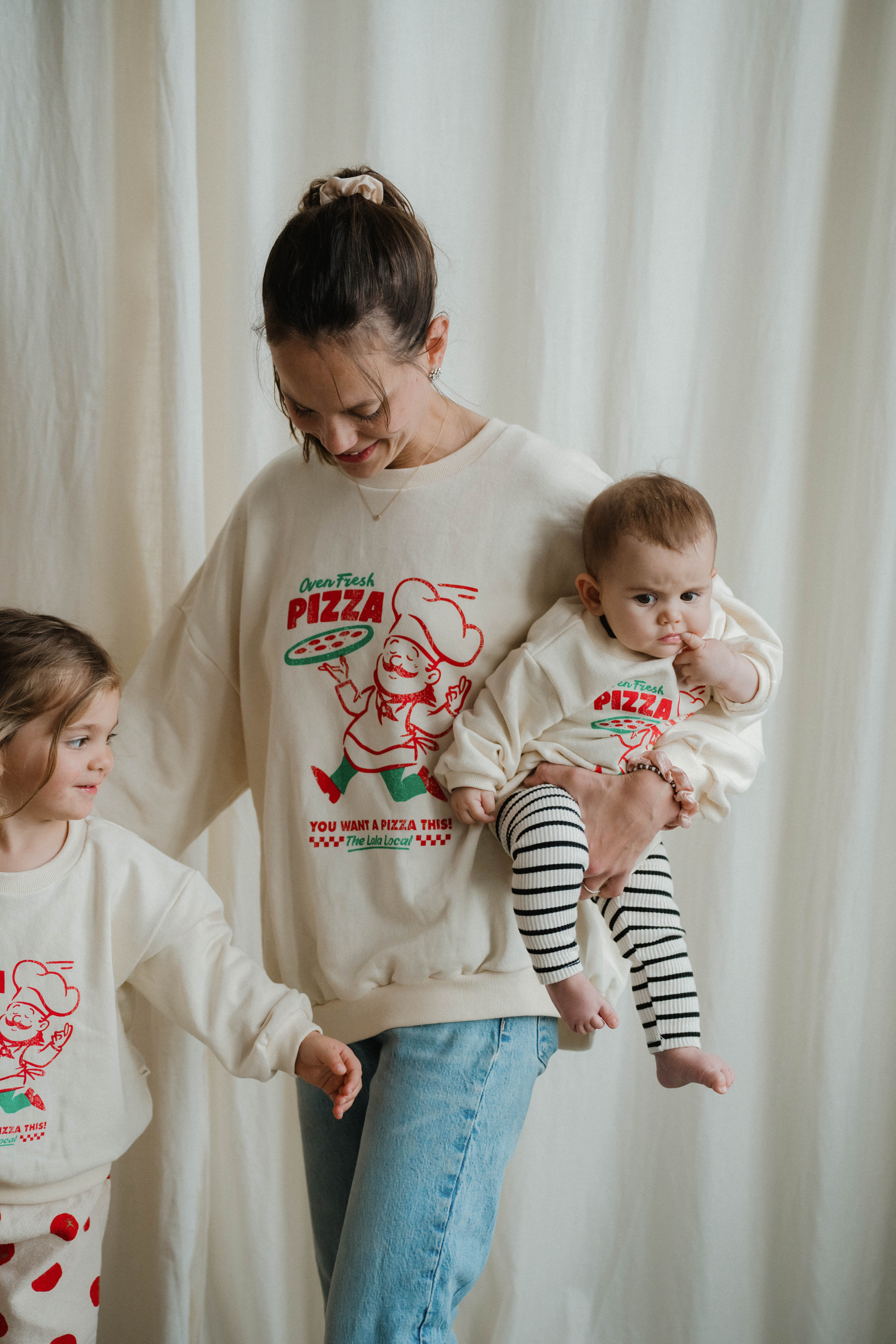 Spart automatisch 20€ beim Kauf von 3 Pizza Sweatern (Mom, Kids, und Baby).