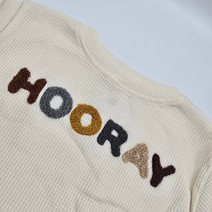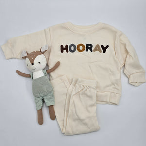 dieses supersüße Set besteht aus einem Waffelstrick-Pullover mit dem bestrickten Schriftzug 'hooray' und einer passenden Hose in einem sanften beige.